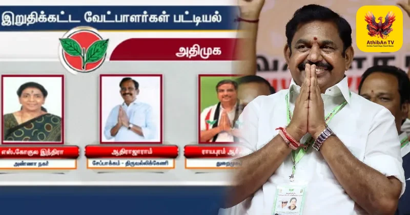 தமிழகச் சட்டமன்றத் தேர்தலை முன்னிட்டு, அனைத்திந்திய அண்ணா திராவிட முன்னேற்றக் கழகத்தின் இறுதிக்கட்ட வேட்பாளர் பட்டியலை அக்கட்சியின் பொதுச்செயலாளர் எடப்பாடி பழனிசாமி இன்று வெளியிட்டுள்ளார். குறிப்பாகச் சென்னை மற்றும் அதன் சுற்றுவட்டாரத் தொகுதிகளில் அனுபவம் வாய்ந்த முன்னாள் அமைச்சர்கள் மற்றும் முக்கிய நிர்வாகிகளுக்கு வாய்ப்பு வழங்கப்பட்டுள்ளது.