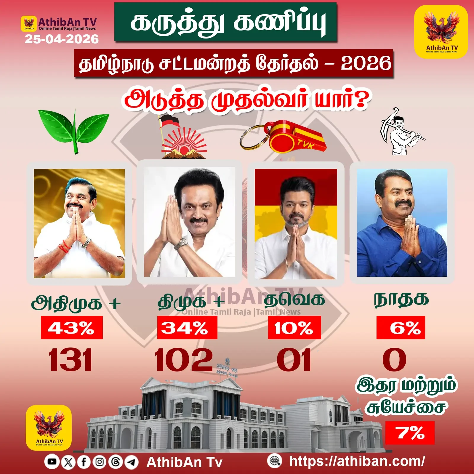 சென்னை: 2026-ம் ஆண்டு நடைபெறவுள்ள தமிழ்நாடு சட்டமன்றத் தேர்தலை முன்னிட்டு, ‘அதிபன் டிவி’ (Athiban TV) நடத்தியுள்ள புதிய கருத்துக்கணிப்பு முடிவுகள் வெளியாகியுள்ளன. இந்த முடிவுகள் தமிழக அரசியலில் பெரும் பரபரப்பை ஏற்படுத்தியுள்ளன.
