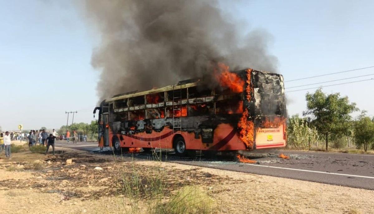 ராஜஸ்தானில் ஜெய்சால்மரிலிருந்து ஜோத்பூர் செல்லும் பேருந்தில் திடீரென தீவிபத்து ஏற்பட்டதில் 20 பேர் பரிதாபமாக உயிரிழந்தனர்.